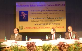 having opportunities to remain first-rate scientists. The Abdus Salam Memorial Lecture, started by the Department of Physics, Jamia Millia Islamia, New Delhi, tries to perpetuate the ideas that Salam believed in; namely the need for developing countries to encourage education and research in the fundamantal sciences. An eminent person of science is invited each year to deliver this lecture. The style and content of the lectures is such as to inspire and to convey the excitement of new discoveries, ideas and challenges. |